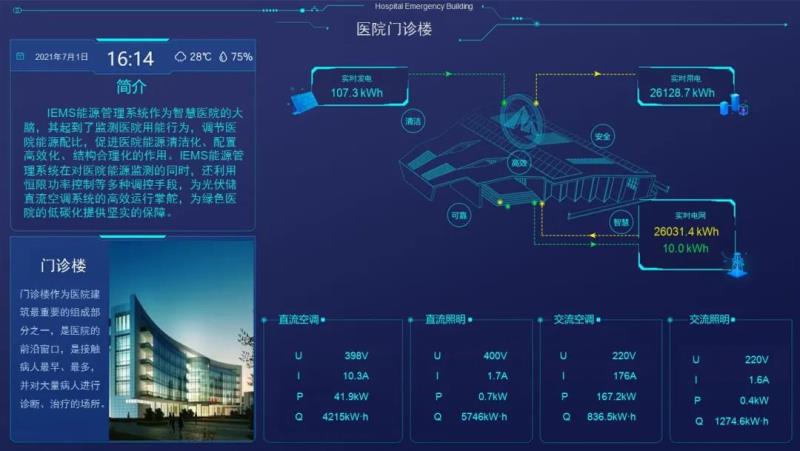 此外,IEMS能源管理系統(tǒng)也是智慧醫(yī)院的一個(gè)重要組成部分。作為智慧醫(yī)院的大腦,其起到了監(jiān)測(cè)醫(yī)院用能行為,調(diào)節(jié)醫(yī)院能源配比,促進(jìn)醫(yī)院能源清潔化、配置高效化、結(jié)構(gòu)合理化的作用。IEMS能源管理系統(tǒng)在對(duì)醫(yī)院能源監(jiān)測(cè)的同時(shí),還利用恒限功率控制等多種調(diào)控手段,為光伏(儲(chǔ))直流空調(diào)系統(tǒng)的高效運(yùn)行掌舵,為綠色醫(yī)院的低碳化提供堅(jiān)實(shí)的保障。