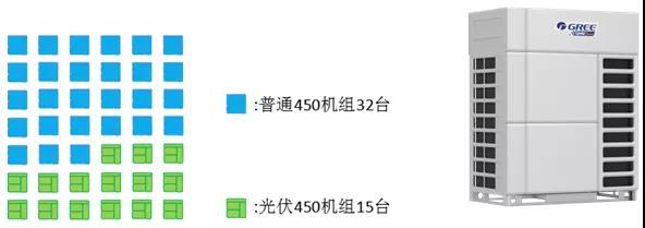 按照每臺(tái)光伏機(jī)組最佳(全部使用450WP光伏組件,使單位面積光伏發(fā)電功率達(dá)到最大)接入16.2kW光伏組件,共需15套GMV450光伏(儲(chǔ))直流空調(diào)系統(tǒng);按照1.859MW制冷量計(jì)算,共需42套450空調(diào)系統(tǒng)(15套GMV450光伏(儲(chǔ))直流空調(diào)系統(tǒng)和27套普通450空調(diào)系統(tǒng))。