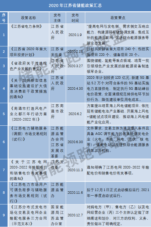 2020年江蘇省儲(chǔ)能項(xiàng)目匯總?cè)缦拢?