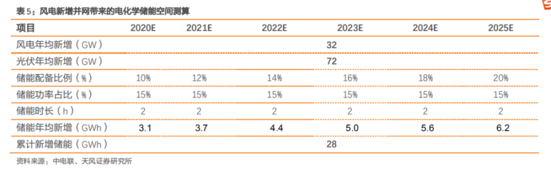 在能源結(jié)構(gòu)轉(zhuǎn)型,新能源裝機(jī)高增,各地政府要求配置儲(chǔ)能的背景下,我們對(duì)我國新能源并網(wǎng)帶來的儲(chǔ)能空間進(jìn)行測(cè)算。預(yù)計(jì) 2020-2025 年間,風(fēng)電、光伏并網(wǎng)帶來的新增儲(chǔ)能需求合計(jì)為 28GWh,年均新增儲(chǔ)能需求為 4.7GWh。測(cè)算假設(shè):①新增裝機(jī):根據(jù)表 3 的測(cè)算結(jié)果,假定 2020-2025 年,風(fēng)電光伏新增裝機(jī)呈線性增長,每年合計(jì)新增裝機(jī)規(guī)模 104GW;②儲(chǔ)能配比率:從 2020 年各地要求的儲(chǔ)能配比率來看,最低配比要求 5%,最高配比要求 20%。我們假定 2020 年實(shí)現(xiàn)配比率 10%,以后每年配比率逐漸上升 2pct,至 2025 年實(shí)現(xiàn)配比率 20%;③儲(chǔ)能功率占比:根據(jù)現(xiàn)有儲(chǔ)能項(xiàng)目功率配比情況,假設(shè)為 15%;④儲(chǔ)能時(shí)長:按 2h 的平均備電時(shí)長作為估算值。