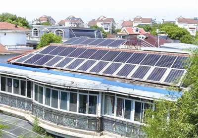 在趙春江的帶領(lǐng)下,記者爬上他家樓頂,看到上面布局著一排建筑一體化光伏方陣,仔細(xì)一數(shù),整個(gè)樓頂一共安裝了30塊光伏板,受光面積約50平方米,共計(jì)7.95 kW,其中13塊共4kW構(gòu)成獨(dú)立的全直流微電網(wǎng)用于實(shí)驗(yàn),其他17塊3.95kW通過(guò)逆變器并入電網(wǎng)運(yùn)行。