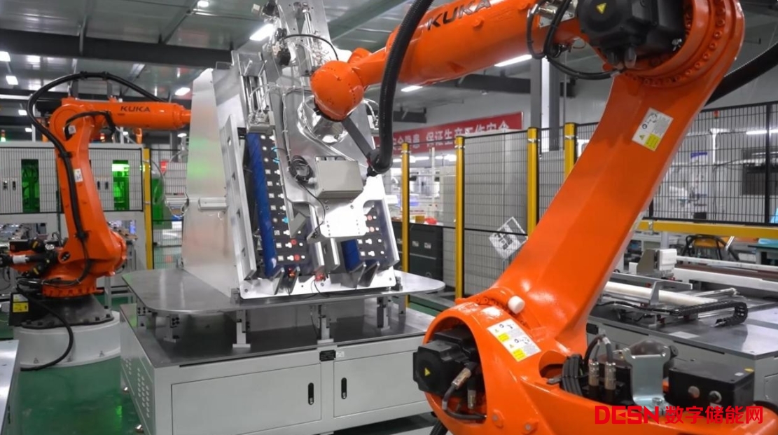智能工廠內(nèi)無(wú)人機(jī)械臂擺放電池模組。