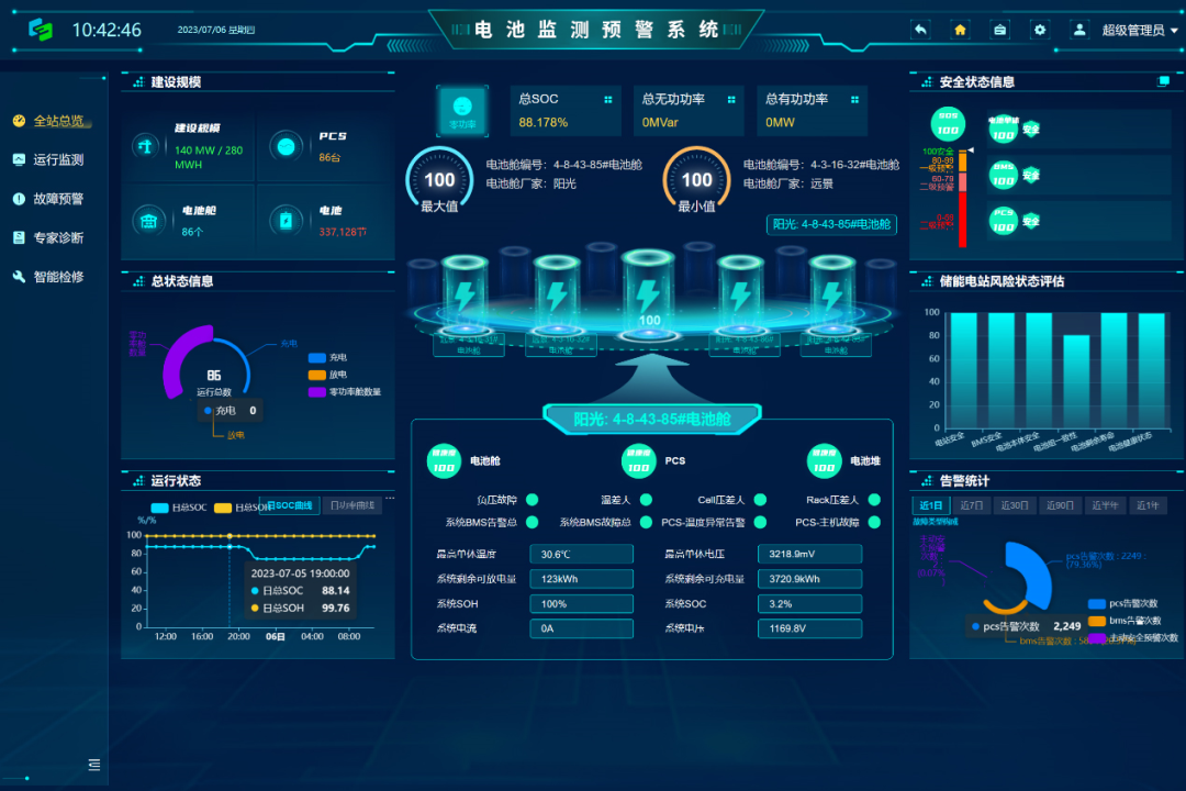 系統(tǒng)底層邏輯是檢測預(yù)警主動安全體系,通過儲能電站電池健康狀態(tài)監(jiān)測和安全診斷和典型故障預(yù)警技術(shù),實時監(jiān)測儲能電站的運行狀態(tài),并實現(xiàn)典型故障的提前預(yù)警。