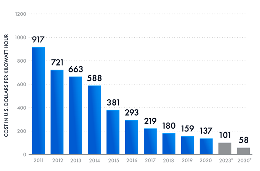 Figure 7. Lithium-ion battery price drop between 2011 and 2030. Source: Statista
