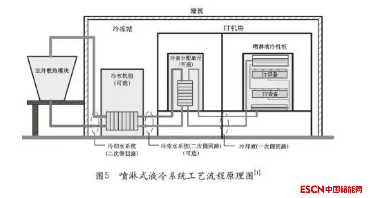 噴淋式液冷系統(tǒng)采用某種冷卻液并通過冷卻液直接或者間接吸熱帶走器件所釋放的廢熱至IDC外部環(huán)境進(jìn)行集中散熱的散熱形式。噴淋式液冷主要特征為絕緣非腐蝕特性的冷卻液直接噴淋到發(fā)熱器件表面或者是與發(fā)熱器件接觸的擴(kuò)展表面上吸熱后并排走,排走的熱流體通過直接與間接與外部環(huán)境大冷源進(jìn)行熱交換。