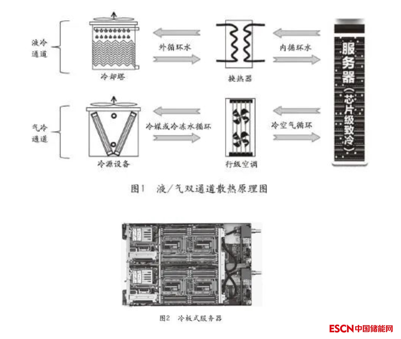 冷板式液冷技術(shù)是在常規(guī)風(fēng)冷服務(wù)器基礎(chǔ)上,CPU和內(nèi)存?zhèn)染o貼一塊板式換熱器,芯片的熱量通過熱傳導(dǎo)至板內(nèi)流體,流體為絕緣介質(zhì),可為去離子水、乙二醇溶液、氟化液等、或相變的熱管(熱管通過換熱器將熱傳導(dǎo)至機(jī)房外水系統(tǒng))。冷卻的板片與服務(wù)器的PU/GPU(高熱流密度元件)通過直接接觸將服務(wù)器的主要熱量帶走(冷板內(nèi)有熱管和液體散熱兩種形式),其余部件(低熱流密度元件)熱量可通過較高溫的風(fēng)帶走,我們把這種由液冷和氣冷結(jié)合的散熱技術(shù)稱為液/氣雙通道散熱技術(shù),原理如圖1所示。圖2所示為冷板式服務(wù)器外形。