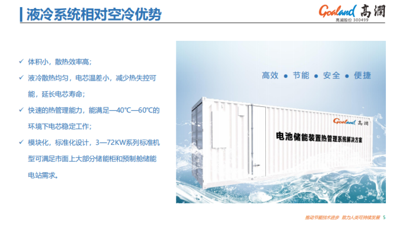 回到儲(chǔ)能系統(tǒng),液冷跟早期我們?cè)谥饕獌?chǔ)能系統(tǒng)上應(yīng)用的風(fēng)冷是有些區(qū)別的,重點(diǎn)在三個(gè)方面,第一個(gè)是換熱效率方面,我們從一些研究中可以看到,儲(chǔ)能的液冷要在總體的換熱能力上優(yōu)于風(fēng)冷系統(tǒng)。正常來(lái)說(shuō),一個(gè)簡(jiǎn)單的數(shù)據(jù)來(lái)顯示就是它的換熱系數(shù),液冷的換熱系數(shù)大概在1000到1.5萬(wàn)之間,風(fēng)冷的換熱系數(shù)只有25-100之間。換熱系數(shù)的提升,意味著一件事情,就是我的液冷系統(tǒng)比風(fēng)冷系統(tǒng)能夠更好地帶走熱量。從這個(gè)角度來(lái)說(shuō),更利于整個(gè)系統(tǒng)的溫度控制。同時(shí)它也意味著可以用一個(gè)相對(duì)高的溫度吸收相應(yīng)的熱量,這就可以產(chǎn)生一定的節(jié)能效果。很大程度上來(lái)說(shuō),風(fēng)冷是需要維持一個(gè)很低的溫度的。