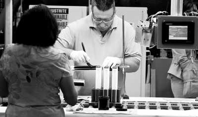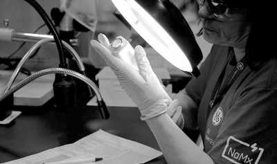 ?、軋D中一名工人正在檢查生產(chǎn)完成的電解質(zhì)陶瓷。