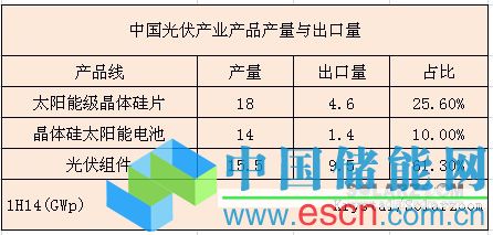 中國大陸光伏組件制造商2014上半年出口量9.5GWp,總價值66億美元,其中日本、美國及歐洲出貨量分別為2GWp(23.7億美元)、2GWp(13.5億美元)及1.9GWp(13.4億美元)。