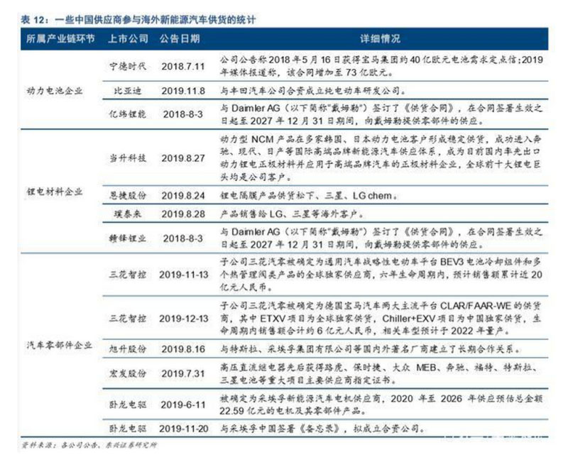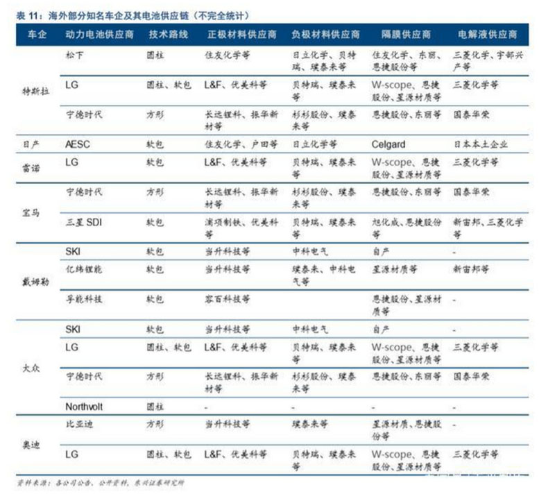 我們梳理了海外部分知名車企及其動(dòng)力電池供應(yīng)鏈體系,如表 11 所示。從中可見(jiàn),中國(guó)的部分動(dòng) 力電池及相關(guān)材料供應(yīng)商,已參與其中。