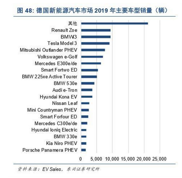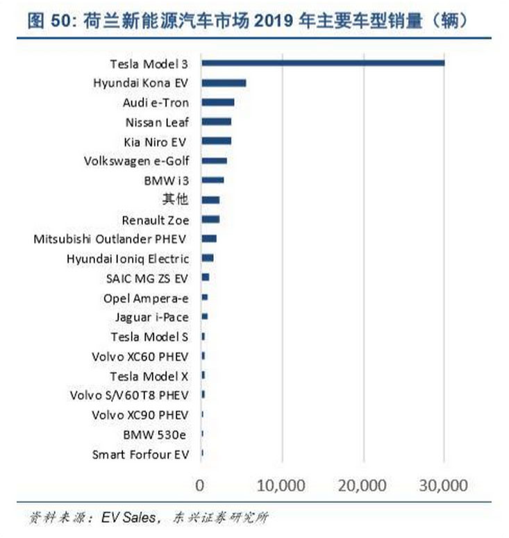 從 EV Sales 發(fā)布的 2019 年德國(guó)、法國(guó)、荷蘭、挪威的新能源汽車品牌排行榜來(lái)看,Tesla Model 3、 雷諾 Zoe、日產(chǎn)聆風(fēng)等純電動(dòng)車型受歡迎程度較高,如圖48~51 所示。其中,Tesla Model 3 在四國(guó)市 場(chǎng)皆位列前三,在荷蘭占據(jù) 44.9%份額;雷諾 Zoe 在法國(guó)占據(jù) 30.6%份額,在德國(guó)市場(chǎng)亦排名第一;日 產(chǎn)聆風(fēng)在法國(guó)、荷蘭、挪威市場(chǎng)皆位列前四。