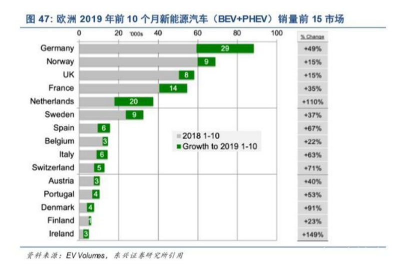 2019 年歐洲新能源汽車市場(chǎng)便已呈現(xiàn)較高增速,與中國(guó)市場(chǎng)產(chǎn)銷下降的局面形成對(duì)比。據(jù) EV Volumes 發(fā)布的數(shù)據(jù),2019 年前 10 個(gè)月,歐洲市場(chǎng)的純電動(dòng)(BEV)和插電式混合動(dòng)力(PHEV)車 銷量為 45.14 萬(wàn)輛,同比增長(zhǎng) 39%,如圖 47 所示。其中,德國(guó)、挪威、英國(guó)、法國(guó)、荷蘭、瑞典位列 前六強(qiáng),荷蘭、德國(guó)的銷量同比增速分別達(dá)到 110%、49%。