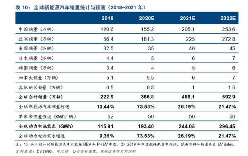 放眼全球,新能源汽車市場(chǎng)發(fā)展呈現(xiàn)加速之勢(shì),歐洲市場(chǎng)將持續(xù)貢獻(xiàn)重要增量。綜合 EV-sales 和中 汽協(xié)統(tǒng)計(jì)數(shù)據(jù),我們測(cè)算,2019 年全球新能源汽車市場(chǎng)合計(jì)銷量為 222.9 萬(wàn)輛;我們預(yù)計(jì),2020 年有 望達(dá)到 386.8 萬(wàn)輛,同比增長(zhǎng) 73.53,其中海外市場(chǎng)銷量 231.6 萬(wàn)輛,同比增長(zhǎng) 1.26 倍,如表 10 所示。