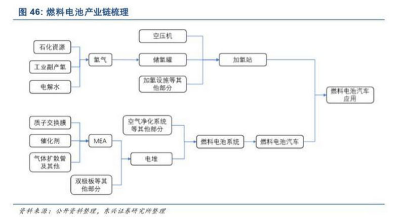 FCV 產(chǎn)業(yè)鏈環(huán)節(jié)眾多,如圖 46 所示,包括兩條主線:燃料電池研發(fā)與制造主線,包括質(zhì)子交換膜、 催化劑、雙極板、電堆集成等多個(gè)環(huán)節(jié);氫燃料主線,包括上游氫氣制備、中游氫氣存儲(chǔ)、加氫站運(yùn)營(yíng) 等多個(gè)環(huán)節(jié)。