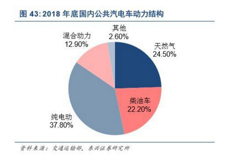 對(duì)于公交車市場(chǎng),交通運(yùn)輸部數(shù)據(jù)顯示,2018 年末,全國(guó)擁有公共汽電車 67.34 萬(wàn)輛,純電動(dòng)占 比 37.8%,混合動(dòng)力占比 12.9%,合計(jì)占比已經(jīng)達(dá)到 50.7%,24.5%是天然氣車,如圖 43 所示,可見(jiàn) 公交車領(lǐng)域電動(dòng)化替代空間較為有限。