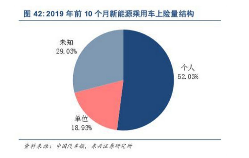 2019 年中國(guó)大陸銷售的新能源汽車中,乘用車占比88.2%,如圖 41 所示。但是,新能源乘用車在 中國(guó)個(gè)人消費(fèi)市場(chǎng)的品牌與價(jià)值認(rèn)可度仍待提升。當(dāng)前乘用車銷量中包含了流向網(wǎng)約車市場(chǎng)的車輛,總 量數(shù)據(jù)并不能真實(shí)反映個(gè)人消費(fèi)者需求強(qiáng)度。據(jù)微信公眾號(hào)“中國(guó)汽車報(bào)”2019 年 12 月 18 日文章報(bào)道, 2019 年前 10 個(gè)月,新能源乘用車?yán)塾?jì)上險(xiǎn)量為 71.3 萬(wàn)輛,從所有權(quán)屬性來(lái)看,個(gè)人、單位分別占比 52%、19%;另有 20.7 萬(wàn)輛的上險(xiǎn)量所有權(quán)為“未知”,占比 29%。如圖42 所示。假設(shè)新能源商用車都 銷售給非個(gè)人車主,且前述上險(xiǎn)量統(tǒng)計(jì)與全年情況一致,則 2019 年銷售給個(gè)人消費(fèi)者的乘用車在新能 源汽車總銷量中的占比測(cè)算值為 45.86%。可見(jiàn),新能源汽車個(gè)人消費(fèi)市場(chǎng)仍有很大挖掘潛力。