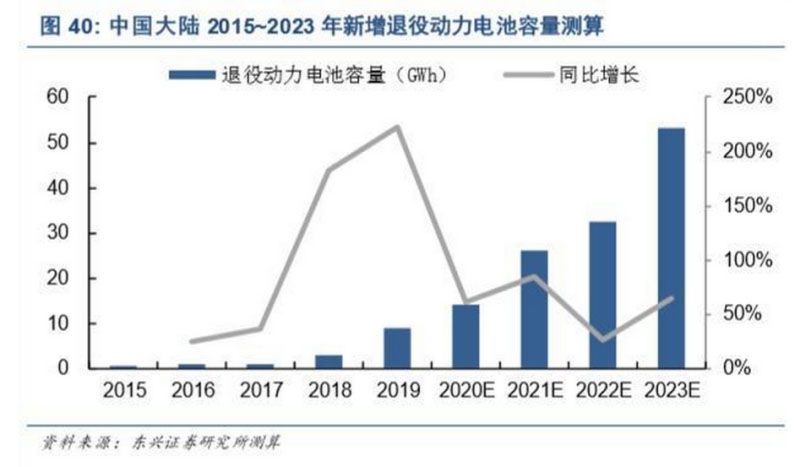 隨著鋰電系新能源汽車加大推廣,動(dòng)力電池退役后的管理問(wèn)題被提上議事日程。我們預(yù)估,2015~ 2019 年期間步入退役期(含已處理)的動(dòng)力電池不足 15GWh,而 2020~2023 年期間預(yù)計(jì)將累計(jì)新增 超過(guò) 120GWh 退役動(dòng)力電池,如圖 40 所示。