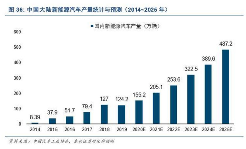 我們合理假設(shè),2025 年我國(guó)汽車銷量為 2,700 萬(wàn)輛,則前述 25%目標(biāo)對(duì)應(yīng)的新能源汽車銷量預(yù)期 為 675 萬(wàn)輛,較 2019 年實(shí)際銷量(120.6 萬(wàn)輛)的年復(fù)合增速約 33.2%。我們認(rèn)為,這反映了決策層 對(duì)新能源汽車產(chǎn)業(yè)的長(zhǎng)期支持態(tài)度,但 2025 年銷量占比目標(biāo)能否實(shí)現(xiàn),存在一定程度的不確定性。我 們目前對(duì) 2025 年新能源汽車產(chǎn)量的預(yù)測(cè)為 487.6 萬(wàn)輛(含外資品牌新能源乘用車 259.5 萬(wàn)輛),低于前 述目標(biāo)測(cè)算數(shù)據(jù),如圖 36 所示。