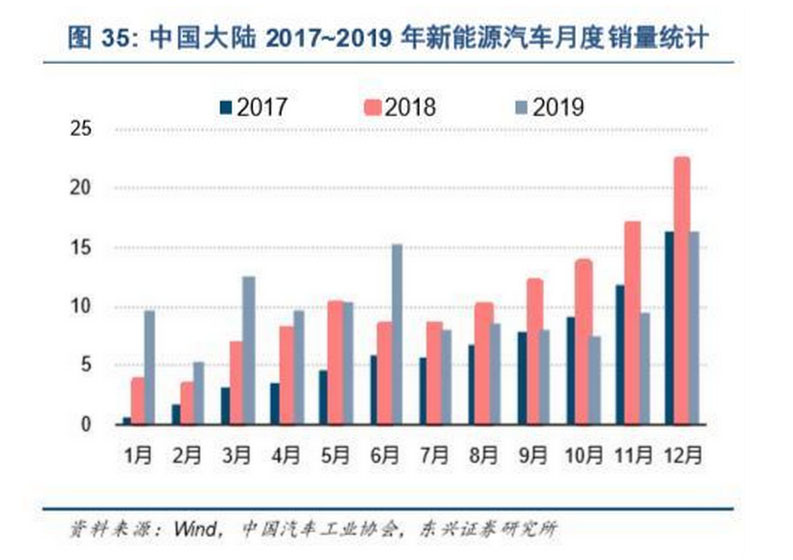 但補(bǔ)貼政策帶來(lái)的性價(jià)比不具備可持續(xù)性。在國(guó)內(nèi)補(bǔ)貼額度退坡幅度較大的 2019 年下半年,新能 源汽車的銷量從 7 月開(kāi)始就出現(xiàn)了連續(xù) 6 個(gè)月的同比負(fù)增長(zhǎng),如圖 35 所示, 2019 全年產(chǎn)量、銷量分 別同比下滑 2.3%至 124.2 萬(wàn)輛、下滑 4.0%至 120.6 萬(wàn)輛。
