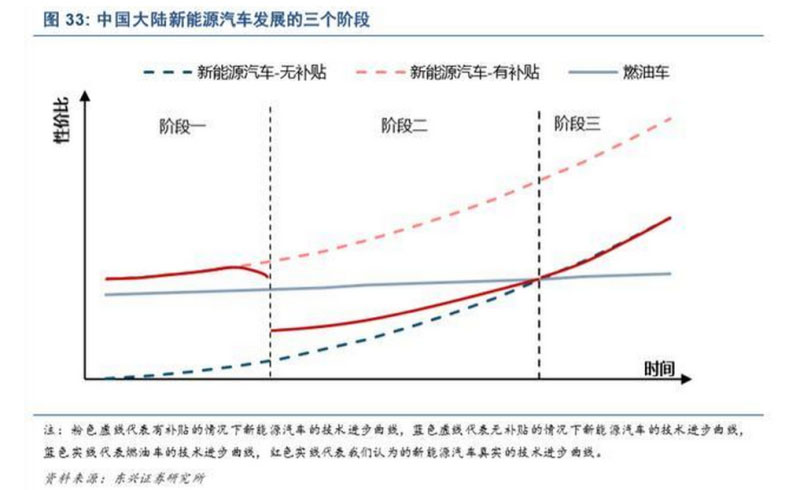 新能源汽車是相對(duì)于傳統(tǒng)燃油車而言的,其本質(zhì)是汽車驅(qū)動(dòng)力由化石燃料向電力的轉(zhuǎn)換。因?yàn)榛?燃料和內(nèi)燃機(jī)作為交通工具主要的驅(qū)動(dòng)力已經(jīng)有一百多年歷史,其變革需要技術(shù)進(jìn)步、政策推動(dòng)、出行 習(xí)慣改變等多方面共同努力,這就決定了新能源汽車替代傳統(tǒng)燃油車的進(jìn)程是一個(gè)漫長(zhǎng)的過(guò)程。我們認(rèn) 為在傳統(tǒng)燃油車主導(dǎo)的時(shí)代,新能源汽車的發(fā)展或經(jīng)歷三個(gè)階段。如圖 33 所示。