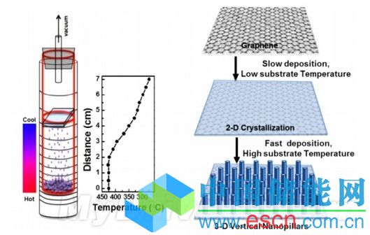 現(xiàn)在,該研究小組發(fā)明了一種新的簡單、靈活的技術,可以生產(chǎn)這種“納米草”。他們將半導體原材料和石墨烯底料放在真空的溫度梯度爐中,開始的低溫能夠先形成一個超薄薄膜,然后隨著溫度的提升,半導體化合物便向硬幣一樣一層層的推疊,一個“納米草”便形成了。