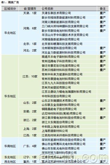 隨著鋰離子電池產(chǎn)業(yè)的快速發(fā)展,我國鋰電池隔膜產(chǎn)量逐漸增長。由于利潤率較高,大概在20%左右,吸引了越來越多的企業(yè)進(jìn)入鋰離子電池隔膜領(lǐng)域。據(jù)高工鋰電產(chǎn)業(yè)研究所(GBII)統(tǒng)計,國內(nèi)共有35家隔膜生產(chǎn)廠商,其中18家已經(jīng)量產(chǎn),占總數(shù)的51.43%。從區(qū)域劃分的角度來看,華東地區(qū)共有1 9家廠商,占總數(shù)的54%;華北地區(qū)共有10家廠商,占總數(shù)的29%;華南地區(qū)共有4家廠商,占總數(shù)的11%;東北和西北地區(qū)分別有1家廠商。珠三角、長三角和華北地區(qū)實現(xiàn)規(guī)模產(chǎn)業(yè)化的企業(yè)數(shù)量較為集中,結(jié)合鋰電池終端產(chǎn)品企業(yè)的地域分布,未來鋰電池隔膜行業(yè)有望在上述三個地區(qū)形成產(chǎn)業(yè)集群。具體隔膜企業(yè)名稱如表1所示。
