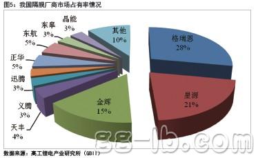 隨著南通天豐、河南義騰、山東正華和佛山東航等廠家產(chǎn)能逐漸釋放,相比于2011年,2012年的市場格局已經(jīng)發(fā)生了一定變化。從企業(yè)的占有率來看,他們占有率依次是:新鄉(xiāng)格瑞恩占28%,深圳星源達(dá)占21%,佛山金輝占15%。具體占有率如圖5所示。