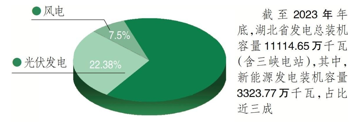 2023年,湖北省發(fā)電裝機容量增加1677.68萬千瓦,同比增長17.78%,其中新能源發(fā)電裝機容量增加1229.91萬千瓦,是新增水電、火電裝機容量的2.75倍,新能源發(fā)電裝機容量占比從2022年年底的22.19%提升至29.90%。