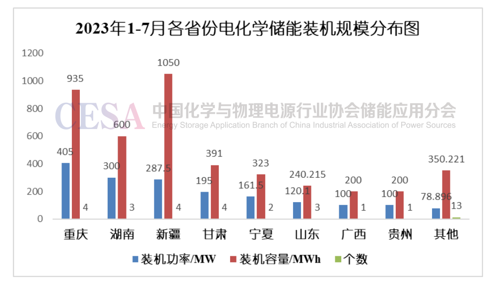 2023年7月,西部地區(qū)投運(yùn)裝機(jī)規(guī)模占很大比例,西北區(qū)域裝機(jī)規(guī)模最大,共投運(yùn)項(xiàng)目11個(gè),總規(guī)模為644.2MW/1764.2MWh,甘肅、新疆、寧夏等省份發(fā)力,均有多個(gè)儲能項(xiàng)目投運(yùn),其中百兆瓦級儲能項(xiàng)目共3個(gè),分別為新疆莎車80萬千瓦光伏+20萬千瓦/80萬千瓦時(shí)儲能一體化項(xiàng)目、寧東200萬千瓦復(fù)合光伏基地項(xiàng)目(二期)和金塔縣晶曦280MW/560MWh儲能電站一期100MW/200MWh項(xiàng)目。而西南區(qū)域裝機(jī)規(guī)模緊隨其后,共有8個(gè)項(xiàng)目投運(yùn),總規(guī)模為505.8MW/1136.4MWh,貴州、重慶兩地大型儲能項(xiàng)目投運(yùn),同樣有3個(gè)百兆瓦級儲能項(xiàng)目:重慶高新區(qū)科學(xué)谷100MW/200MWh儲能電站、中核紫云200MW/400MWh儲能電站(一期200MWh)和重慶合川區(qū)雙槐新型儲能電站,后者是重慶市最大新型儲能電站,裝機(jī)容量24萬千瓦,2小時(shí)能儲滿48萬度電,可滿足28萬戶居民在高峰時(shí)段的用電。華中區(qū)域總裝機(jī)規(guī)模為300MW/600MWh,由湖南投運(yùn)的三個(gè)100兆瓦電網(wǎng)側(cè)儲能項(xiàng)目組成,華東和華南也各有一個(gè)百兆瓦級儲能電站投運(yùn)。