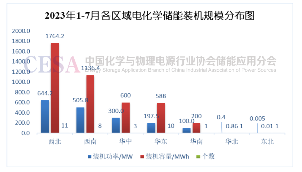 圖3 2023年1-7月各區(qū)域電化學(xué)儲能裝機(jī)規(guī)模分布圖