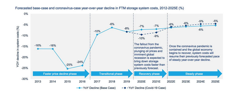 除了電池價格下降之外,由于疫情的影響,電池儲能系統(tǒng)的平衡成本也有所下降。而一旦疫情得到控制,全球經(jīng)濟開始復(fù)蘇,電池儲能系統(tǒng)的成本將恢復(fù)之前預(yù)測的逐年穩(wěn)步下降的趨勢。