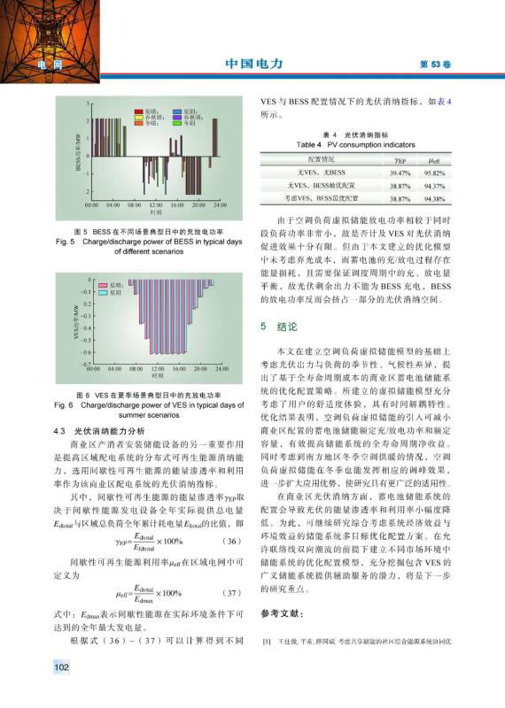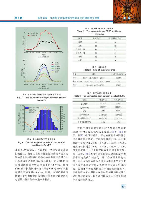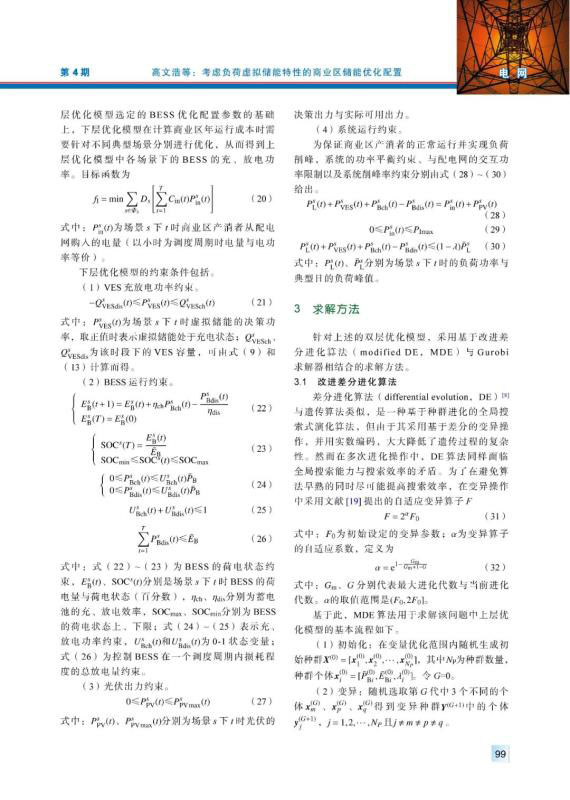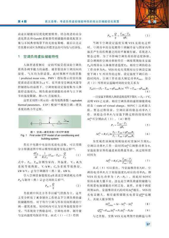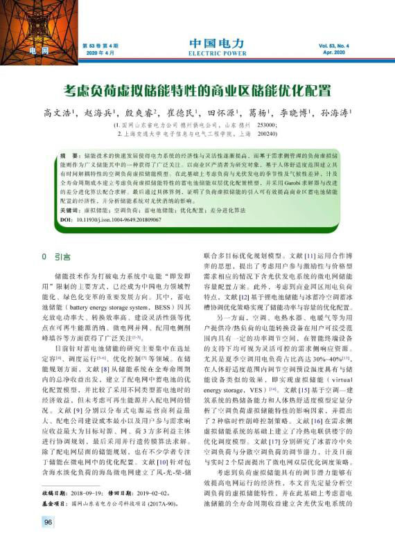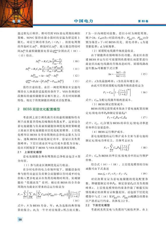 儲(chǔ)能技術(shù)的快速發(fā)展使得電力系統(tǒng)的經(jīng)濟(jì)性與靈活性逐漸提高,而基于需求側(cè)管理的負(fù)荷虛擬儲(chǔ)能則作為廣義儲(chǔ)能其中的一種獲得了廣泛關(guān)注。以商業(yè)區(qū)產(chǎn)消者為研究對(duì)象,基于人體舒適度范圍建立具有時(shí)間解耦特性的空調(diào)負(fù)荷虛擬儲(chǔ)能模型。在此基礎(chǔ)上考慮負(fù)荷與光伏發(fā)電的季節(jié)性及氣候性差異,計(jì)及全壽命周期成本建立考慮負(fù)荷虛擬儲(chǔ)能特性的蓄電池儲(chǔ)能雙層優(yōu)化配置模型,并采用Gurobi求解器與改進(jìn)的差分進(jìn)化算法配合求解。最后通過具體算例,證明了負(fù)荷虛擬儲(chǔ)能的引入可有效提高商業(yè)區(qū)蓄電池儲(chǔ)能配置的經(jīng)濟(jì)性,并分析儲(chǔ)能系統(tǒng)對(duì)光伏消納的影響。