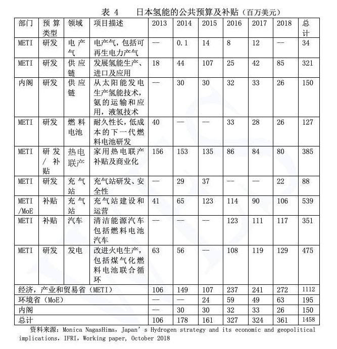資金支持是日本氫能產(chǎn)業(yè)發(fā)展的重要因素之一。經(jīng)濟(jì)產(chǎn)業(yè)和貿(mào)易省(METI)是日本氫能研究的主要資助機(jī)構(gòu),其資助主要通過日本最大的公立研究開發(fā)管理機(jī)構(gòu)——新能源和產(chǎn)業(yè)技術(shù)綜合開發(fā)機(jī)構(gòu)(NEDO)提供。此外,日本環(huán)境?。∕oE)和內(nèi)閣也資助了氫能的研發(fā)和補(bǔ)貼。據(jù)不完全統(tǒng)計(jì),2013--2018年,這三家機(jī)構(gòu)共資助了14.58億美元的氫能研發(fā)和補(bǔ)貼經(jīng)費(fèi),其中經(jīng)濟(jì)產(chǎn)業(yè)和貿(mào)易省11.12億美元,環(huán)境省1.95億美元,內(nèi)閣1.5億美元,具體金額和項(xiàng)目見表4。此外,經(jīng)濟(jì)產(chǎn)業(yè)和貿(mào)易省和環(huán)境省每年還撥出約1.5億美元用于碳捕捉和儲(chǔ)存(CCS)的研發(fā),這對(duì)于化石燃料零排放氫能的生產(chǎn)至關(guān)重要,這一研究預(yù)計(jì)到2020年會(huì)取得初步成果。