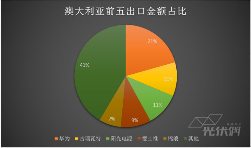 澳大利亞排在出口市場第三名,從出口金額占比來看,華為、古瑞瓦特、陽光電源、愛士惟和錦浪均占有一定比例。