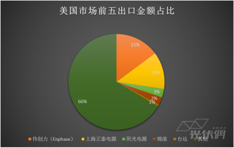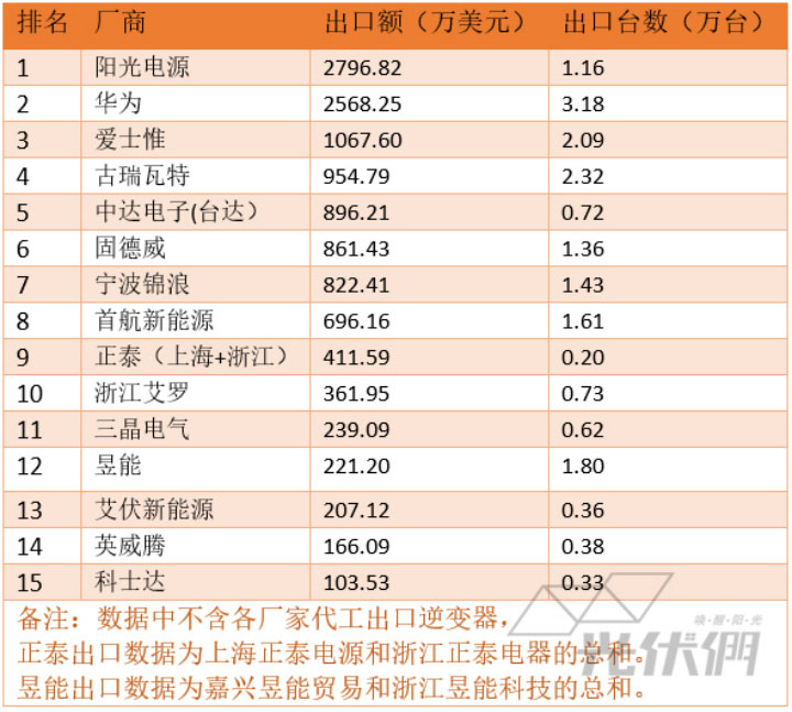 從企業(yè)的出口金額來看,陽光電源、華為分別以相差不大的2796萬美元和2568萬美元出口額排在前兩位,今年首次打入前三的愛士惟達(dá)到了出口金額1067萬美元。古瑞瓦特和臺達(dá)分別以954萬美元和896萬美元緊隨其后,排在第四和第五。