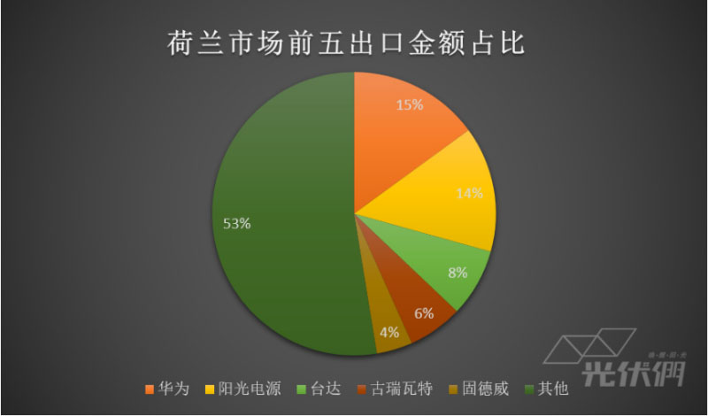 按照具體市場分析,荷蘭的出口比例能夠看到國內(nèi)逆變器廠商的競爭程度,華為、陽光電源、臺達(dá)、古瑞瓦特和固德威占據(jù)荷蘭市場出口前五,錦浪、三晶電氣、首航新能源緊隨其后。