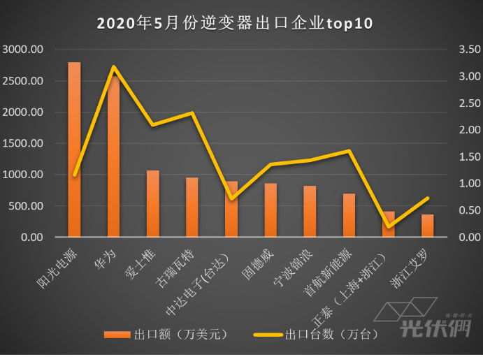 前10家光伏逆變器企業(yè)的出口金額占出口總額的50%,其中陽光電源、華為、愛士惟、古瑞瓦特和中達(dá)電子(臺達(dá))位列五月份出口前五名。