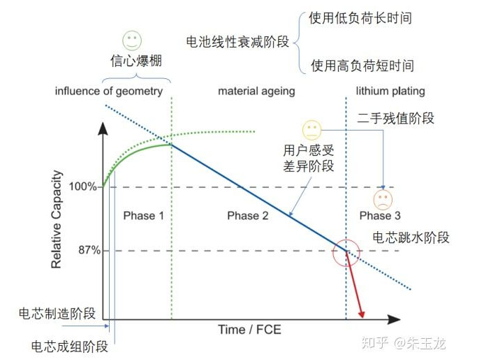 還有一個重要點:動力電池的壽命限制在哪里?從技術的角度來說,我們正常在使用電芯中往往會觀察到三個階段: