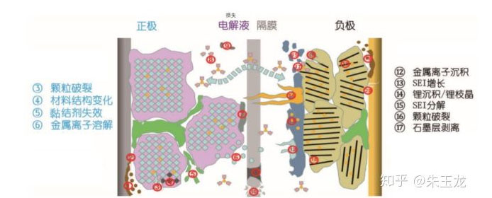 正極材料,在循環(huán)過程中會有不可逆的相變,還有金屬離子溶出;正極材料顆粒破碎,粘結劑分解和正極材料晶體結構改變等因素,會導致一部分正極活性物質失去嵌鋰等能力;負極材料中會有活性物質脫落,粘結劑分解等因素,都會導致部分負極活性物質顆粒失去與導電網(wǎng)絡的導電連接,從而使其無法嵌鋰,造成鋰離子電池容量損失。