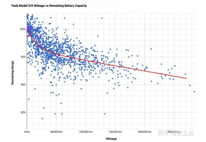 實際上,動力電池在和電動汽車設計中,容量衰減預測和分析,是非常重要的。工程師們通過考慮不同的影響因子,包括環(huán)境溫度、不同使用電池放電深度和使用工況構建數(shù)學模型,對整個電池的可用性要做出大量的驗證工作。如下圖所示,實際上電池的衰減也是呈現(xiàn)出一定的離散型,在16萬公里質保期內努力設計成不會快速跳變的狀態(tài)。