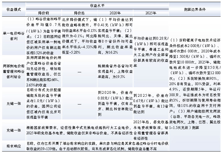 (3)對于客戶側(cè)儲能,需量管理和峰谷價(jià)差共同回收模式下,儲能盈利性水平主要與峰谷價(jià)差、儲能投資建設(shè)成本、循環(huán)次數(shù)、充放電模式、用戶分成比例以及對需量降低的效率影響等指標(biāo)有關(guān)。通過建立儲能成本分析模式進(jìn)行經(jīng)濟(jì)性測算,當(dāng)前,普通工業(yè)和大工業(yè)用戶安裝儲能僅少部分省份能實(shí)現(xiàn)盈虧平衡,隨著儲能技術(shù)經(jīng)濟(jì)性提升,按工業(yè)電價(jià)降價(jià)前目錄電價(jià)計(jì)算,2020年已具有較好的盈利性。按照2019年工業(yè)電價(jià)水平下降要求,在北京市降價(jià)模式下(峰、平、谷價(jià)格統(tǒng)一下降同一額度,峰谷價(jià)差和峰平價(jià)差保持不變),儲能收益略有提升,在多數(shù)省份采用的河北省降價(jià)模式下(下降比例基本相同,峰谷價(jià)差和峰平價(jià)差縮?。?,儲能收益將明顯下降。
