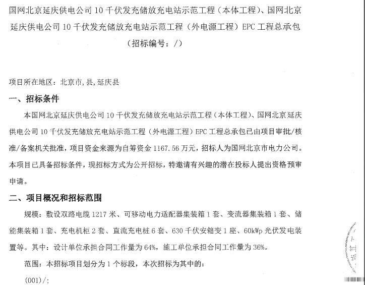 6月10日,國網(wǎng)北京延慶供電公司發(fā)布10千伏發(fā)充儲(chǔ)放充電站示范工程(本體工程及外電源工程)總承包招標(biāo)公告。