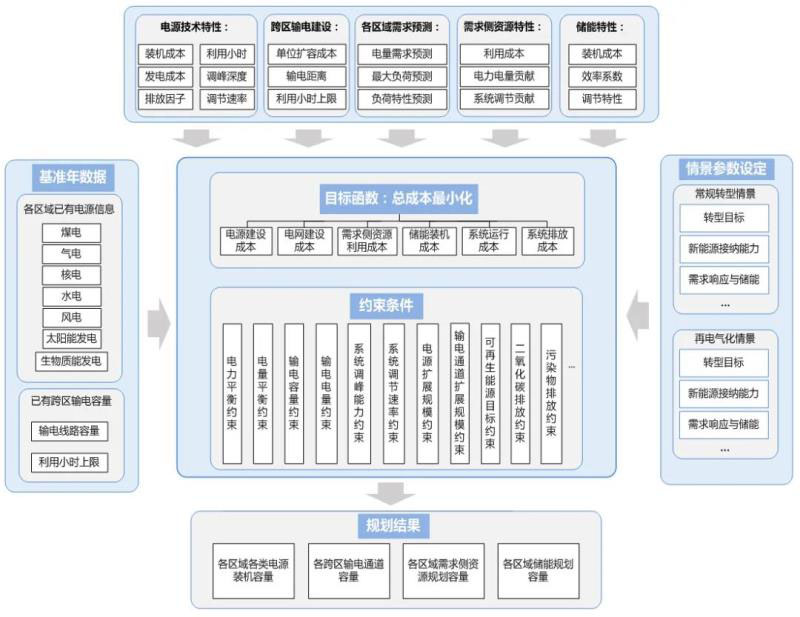 國網能源院能源互聯(lián)網研究所構建了電力系統(tǒng)源-網-荷-儲協(xié)調規(guī)劃模型,自主開發(fā)了程序代碼,能夠對規(guī)劃期內中國各區(qū)域各類電源、輸電通道、需求側資源、儲能等電力系統(tǒng)各個部分進行統(tǒng)籌規(guī)劃,得到電力系統(tǒng)整體最優(yōu)發(fā)展路徑。求解方式為通過建立數學優(yōu)化模型,將規(guī)劃期內各年份各區(qū)域各類源網荷儲元素的發(fā)展規(guī)模設為待求解變量,構建目標函數與約束條件,通過計算機編程的方式,求得一組滿足各項約束條件、且使得目標函數值最小的解。