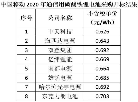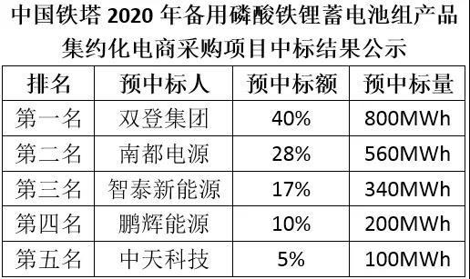 5月25日,中國鐵塔公布《2020年備用磷酸鐵鋰蓄電池組產(chǎn)品集約化電商采購項目中標(biāo)結(jié)果公示》,雙登集團(tuán)、南都電源、智泰新能源、鵬輝能源和中天科技5家企業(yè)預(yù)中標(biāo)。