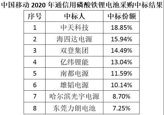 值得注意的是,中國鐵塔此次招標(biāo)中標(biāo)企業(yè)僅5家,中標(biāo)份額較為集中。上月中國移動公布的1.95GWh通信基站備用磷酸鐵鋰電源招標(biāo)結(jié)果有8家企業(yè)中標(biāo)。其中,份額最大的中天科技僅拿下了18.85%的份額(約367.58MWh),而此次雙登集團(tuán)拿下了40%(800MWh)的鐵塔5G備用電源采購,無疑是更大贏家。