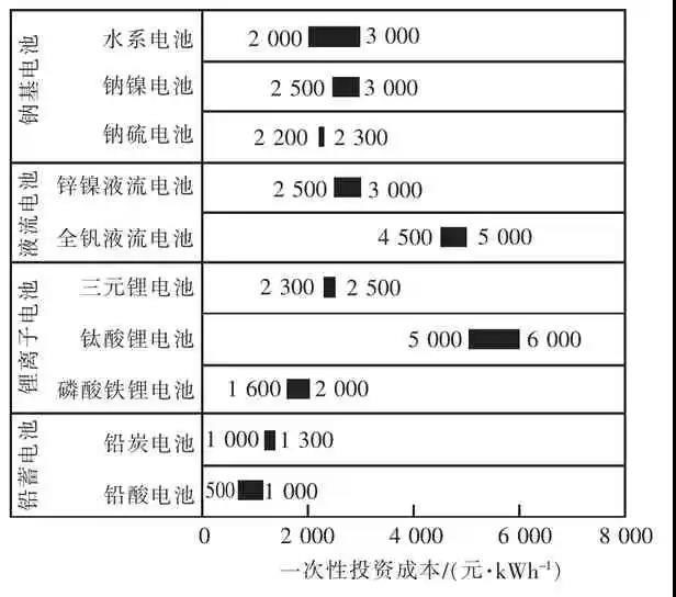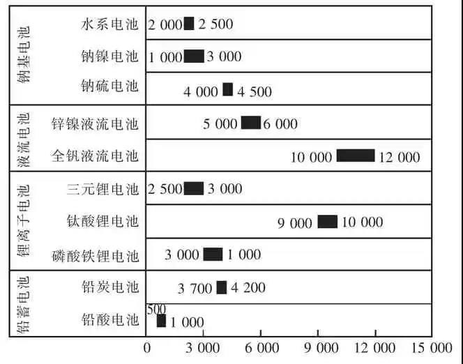 應(yīng)用于儲能工程的鉛蓄電池包括鉛酸電池和鉛炭電池。鉛炭電池是在傳統(tǒng)鉛酸電池基礎(chǔ)上對負(fù)極材料進(jìn)行了電容式改進(jìn)[5],結(jié)合了鉛酸電池和超級電容器兩者的優(yōu)勢,由于加了碳材料,阻止了負(fù)極硫酸鹽化現(xiàn)象,顯著提升了電池的循環(huán)壽命。從鉛酸電池的500~1 000 次(60%~70%DOD,DOD 為放電深度)增加到鉛炭電池的3 700~4 200次(60%~70%DOD),儲能系統(tǒng)投資成本1 000~1 300 元/kWh,度電成本為0.5~0.7 元/kWh。近年來,鉛蓄電池在儲能領(lǐng)域的應(yīng)用多數(shù)以度電成本更低的鉛炭電池為主,尤其是針對工商業(yè)峰谷電價差較高的江蘇、廣東、北京等地已初步具備商業(yè)化應(yīng)用的條件。
