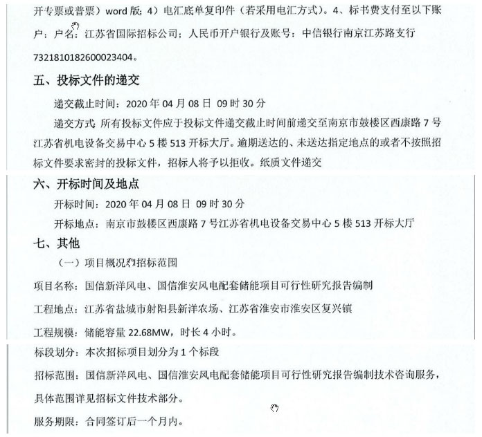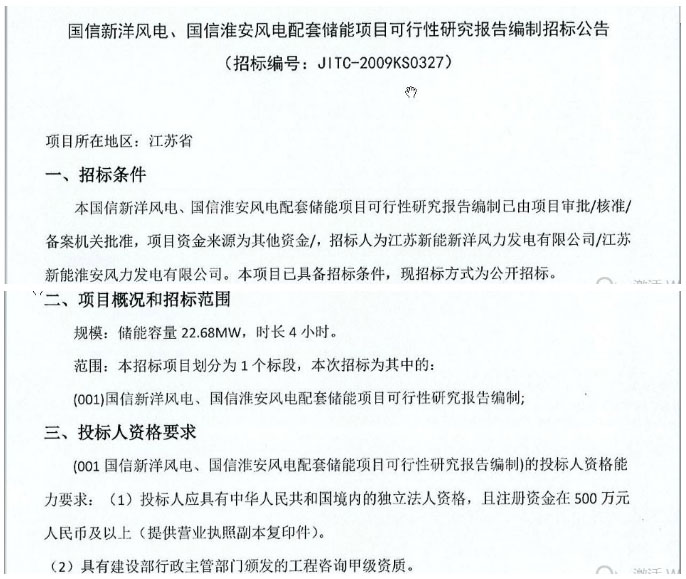 附國(guó)信新洋風(fēng)電、國(guó)信淮安風(fēng)電配套儲(chǔ)能項(xiàng)目可行性研究報(bào)告編制招標(biāo)公告: