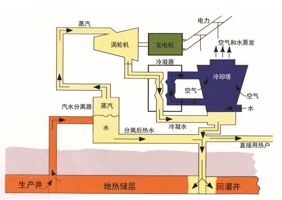 地?zé)岚l(fā)電分為地?zé)岣烧羝l(fā)電、地?zé)釢裾羝l(fā)電、地?zé)犭p工質(zhì)發(fā)電、地?zé)崛靼l(fā)電、干熱巖發(fā)電。世界大功率地?zé)岚l(fā)電主要是地?zé)岣烧羝l(fā)電和地?zé)釢裾羝l(fā)電。地?zé)岣烧羝l(fā)電系統(tǒng)簡(jiǎn)單,經(jīng)濟(jì)性高。干熱巖發(fā)電利用干熱巖地?zé)豳Y源,通過熱交換產(chǎn)生熱水和蒸汽,再驅(qū)動(dòng)汽輪發(fā)電機(jī)組發(fā)電。
