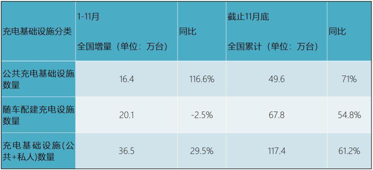 2019年1-11月,我國充電基礎(chǔ)設(shè)施增量為36.5萬臺,同比增加29.5%,公共類充電基礎(chǔ)設(shè)施保持穩(wěn)定增長,隨車配建充電設(shè)施出現(xiàn)同比減少。