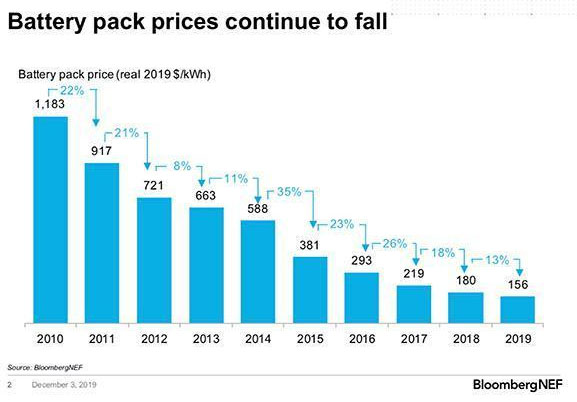 報(bào)告稱,2019年全球鋰離子電池組的價(jià)格下降主要?dú)w功于電動(dòng)車銷量上升、電池訂單增加和高能量密度正極材料的快速推廣應(yīng)用。另外,新的電池包結(jié)構(gòu)設(shè)計(jì)的引入和更低的生產(chǎn)成本,也在短期內(nèi)推動(dòng)著電池價(jià)格的下降。
